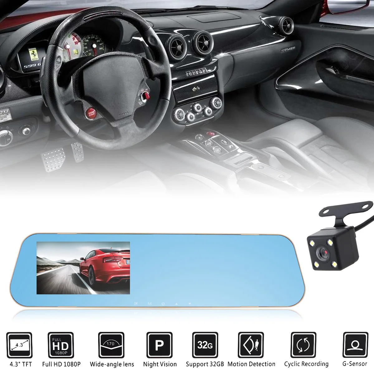 Kopen Goedkoop 4.3 inch Dual Lens Auto DVR Camera Full HD 1080 p 170 Groothoek Auto Achteruitkijkspiegel Video Recorder Dash cam Online